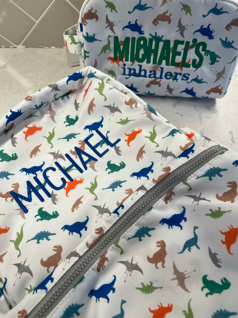 This dino print bag is the perfect item to simplify your packing routine and stay tidy! It has a soft shell and a side handle that can store all your little kiddo's toothpaste, hair care, medications or even an epi-pen if needed! This bag can easily be snugged into your suitcase or stored in your car and has a wide opening and an interior pocket to keep him organized from one trip to the next.