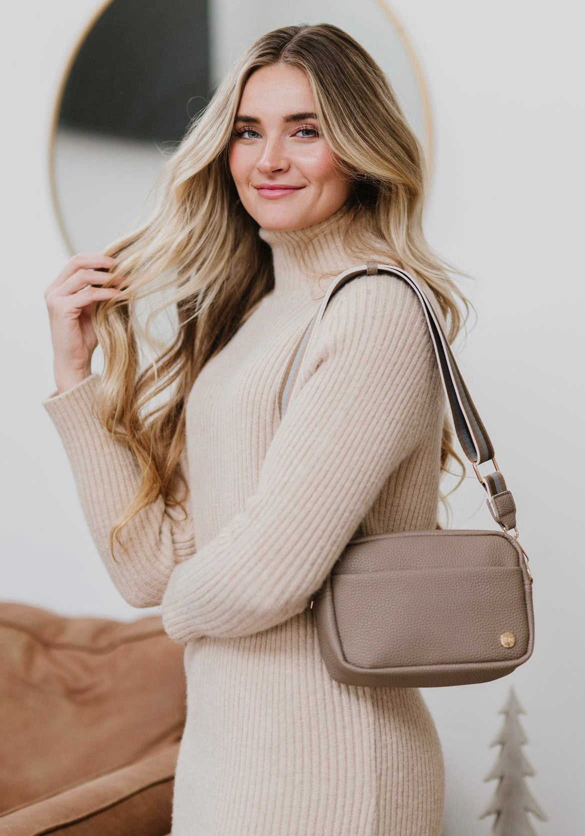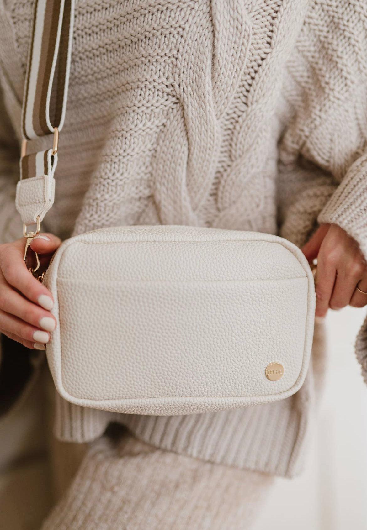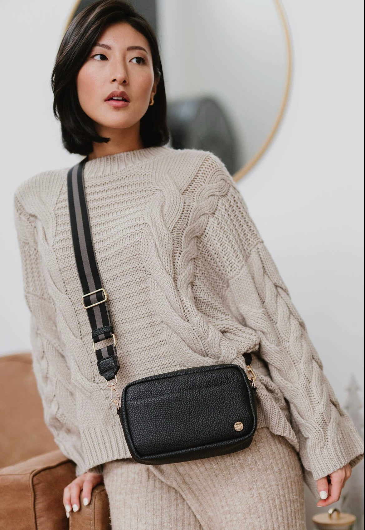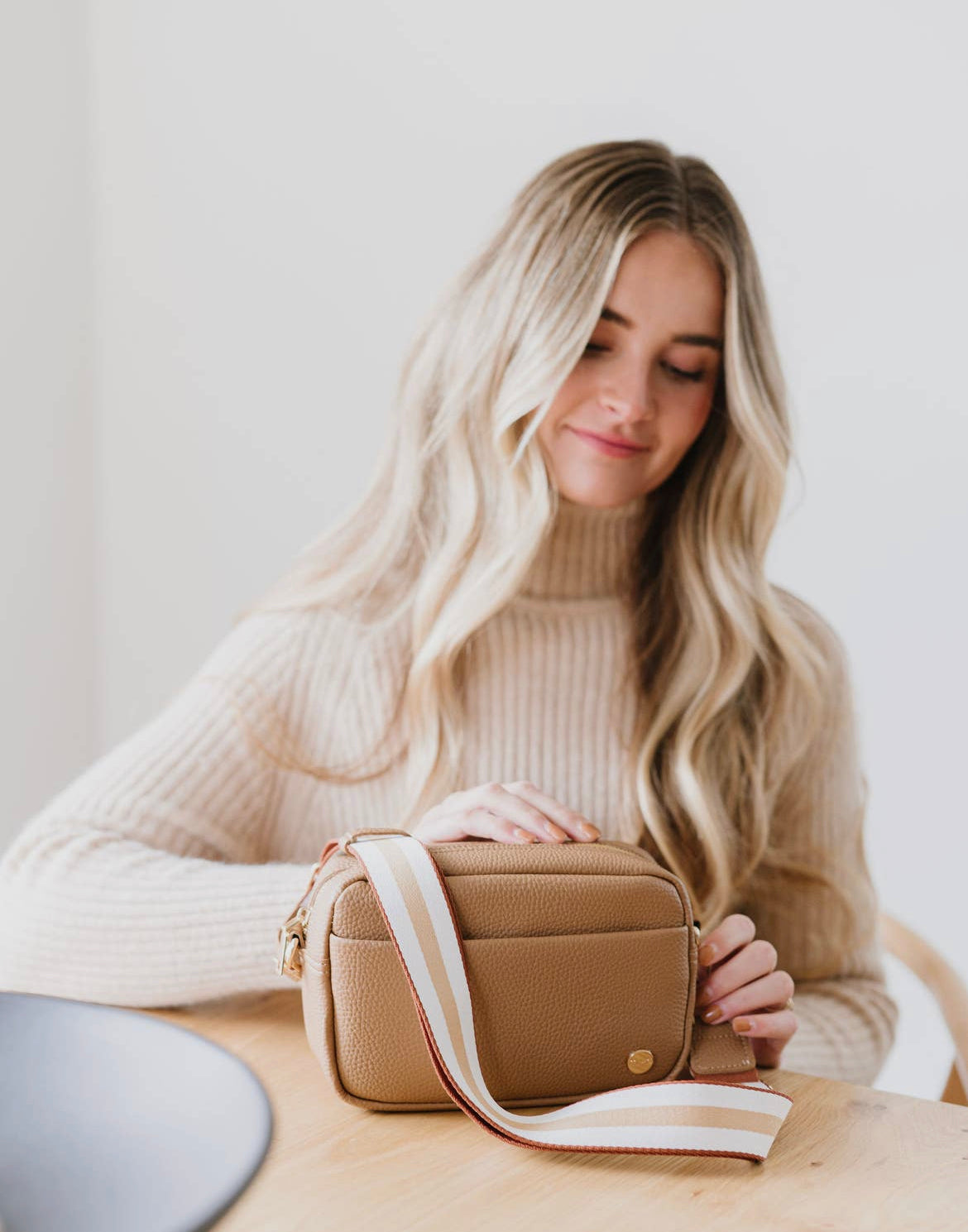 The Versatile size and adjustable subtle striped strap mean you can wear the Willow on the shoulder, crossbody, and as a belt bag. Front and back pockets fit most phones, and the interior slots help keep things organized as you move throughout your day.